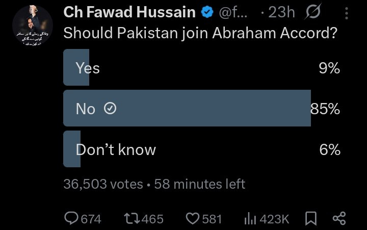 The political trajectory is now clear, the ‘Gaza Peace Plan’ ignores the genocide, it ignores those who committed war crimes and conveniently it ignores those who remained silent. Whilst outright recognising the Zionist entity as legitimate may be a step too far, Pakistan seems to be shifting towards accepting the Abraham Accords or some version of them. Flash polls on social media show that Pakistani’s don’t want anything to do with normalising relations with the Zionist entity.
