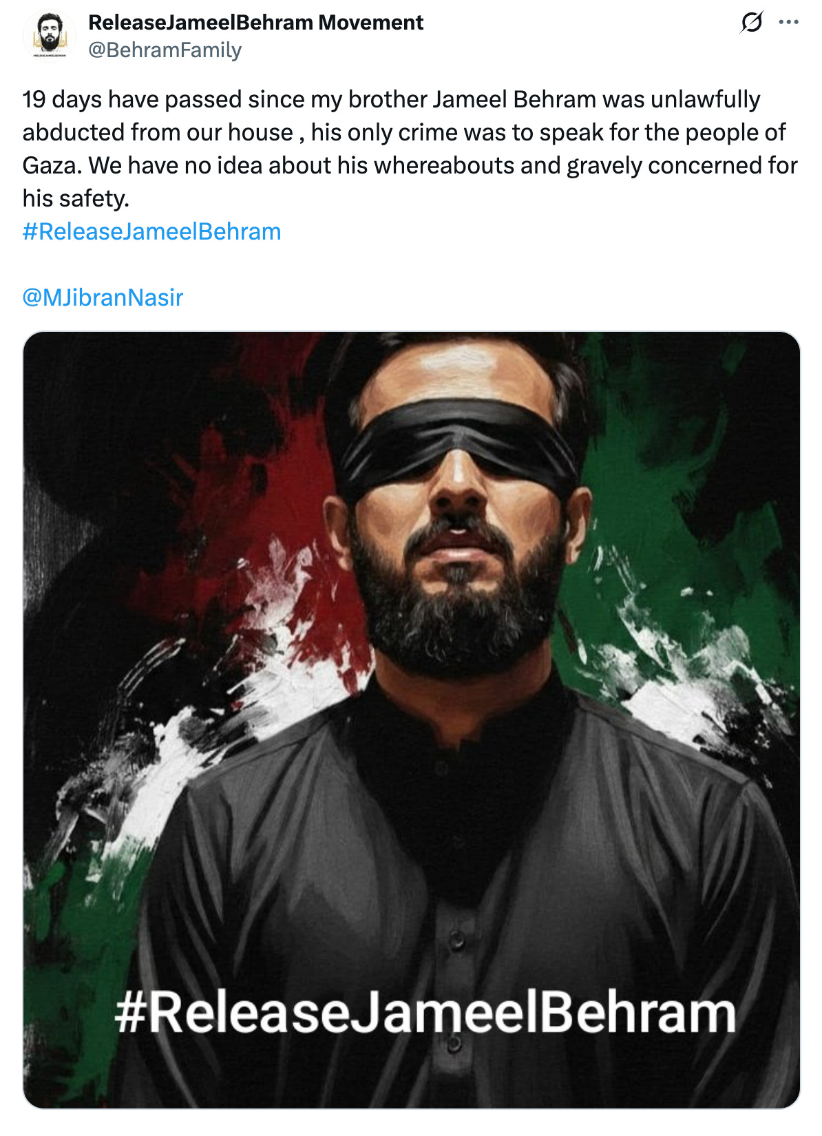 19 days have passed since my brother Jameel Behram was unlawfully abducted from our house , his only crime was to speak for the people of Gaza. We have no idea about his whereabouts and gravely concerned for his safety.